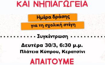 ΔΕΛΤΙΟ ΤΥΠΟΥ Καμπάνια ανάδειξης των κτιριακών προβλημάτων των νηπιαγωγείων του συλλόγου μας! Τα νηπιαγωγεία που έχουμε τα νηπιαγωγεία που δικαιούμαστε! Την Τετάρτη 18 Μαρτίου στις 8 π.μ., κατά την ώρα προσέλευσης των μαθητών/τριών, μέλη του Δ.Σ. του Συλλόγου και συνάδελφοι πραγματοποιήσαμε παρέμβαση ενημέρωσης των γονέων του 26ου Νηπιαγωγείου Πειραιά στην …