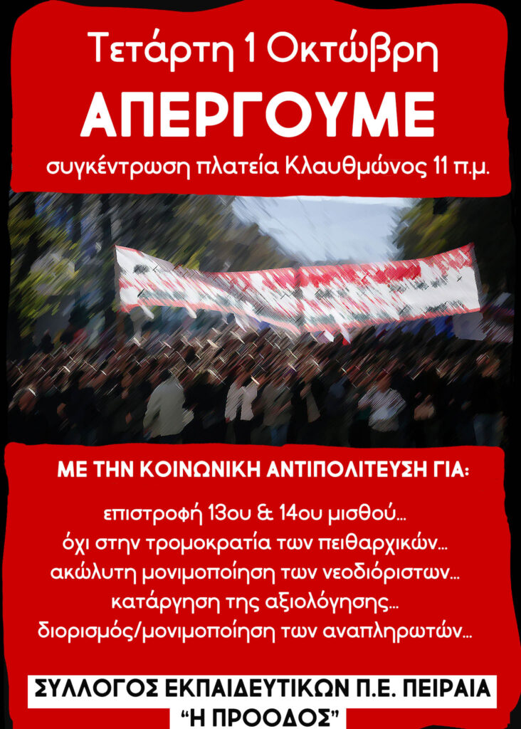 Η απεργία της 1ης Οκτώβρη πρέπει να προκαλέσει έναν κοινωνικό και πολιτικό σεισμό! Και μετά πρέπει όλες και όλοι μαζί να βρούμε τον τρόπο να ανατρέψουμε αυτή την πολιτική και τους φορείς της. Να πάρουμε πίσω τη χαμένη μας αξιοπρέπεια, τα βασικά μας δικαιώματα, να πάρουμε πίσω όσα μας έκλεψαν, να πάρουμε τις ζωές μας στα χέρια μας! Με ανένδοτο αγώνα διάρκειας και ανατροπής!