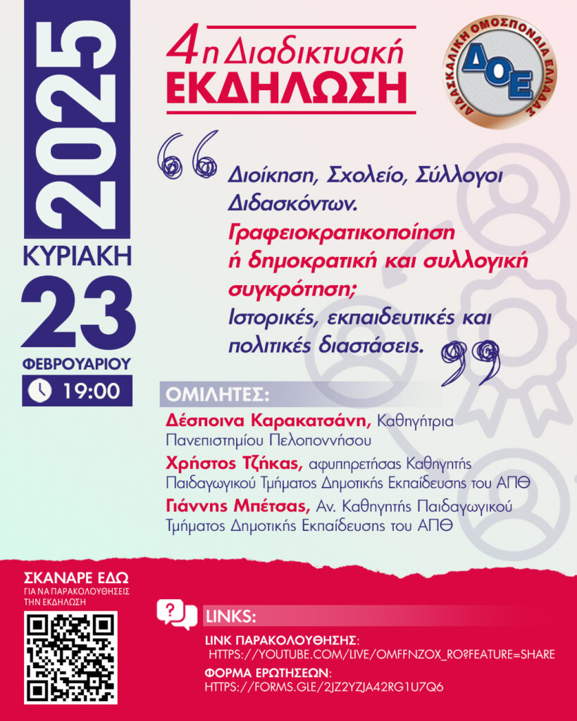 Παρακολουθείστε την Κυριακή 23 Φεβρουαρίου 2025, στις 7:00 μ.μ. την 4η δράση της ΔΟΕ για το 2025 στο πλαίσιο των ενιαίων κειμένων με θέμα:«Διοίκηση, Σχολείο, Σύλλογοι Διδασκόντων. Γραφειοκρατικοποίηση ή δημοκρατική και συλλογική συγκρότηση; Ιστορικές, εκπαιδευτικές και πολιτικές διαστάσεις.»