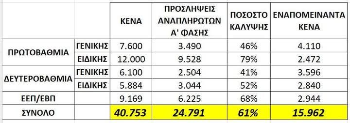 Σε σύνολο σχεδόν 41.000 κενών (έτσι όπως τα ορίζει και υπολογίζει τοπική και κεντρική Διοίκηση του ΥΠΑΙΘΑ), το Υπουργείο προσέλαβε για την Α΄ φάση αναπληρωτών μόλις 25.000 αναπληρωτές εκπαιδευτικούς και ΕΕΠ/ΕΒΠ. Η σχολική χρονιά δηλαδή θα ξεκινήσει με τουλάχιστον 16.000 πραγματικά κενά (!), χωρίς να υπολογίζουμε την Ενισχυτική, τυχόν άδειες/αποσπάσεις, κ.ά. Χρειάζεται ΑΜΕΣΑ δεύτερο κύμα αναπληρωτών!