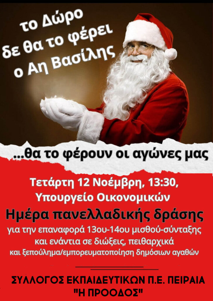 Στο πλαίσιο αυτό, ορίζουμε την Τετάρτη 12 Νοέμβρη 2025 ως Ημέρα Πανελλαδικής Δράσης για τη διεκδίκηση λύσεων στα δίκαια αιτήματά μας και καλούμε σε συγκέντρωση έξω από το υπουργείο Οικονομικών ⌠πλατεία Συντάγματος και Ερμού⌡, ώρα 1.30μμ.