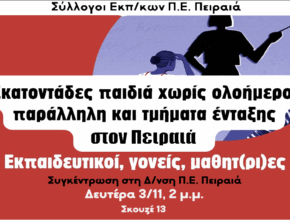 Εκατοντάδες παιδιά χωρίς ολοήμερο, παράλληλη στήριξη και τμήματα ένταξης στον Πειραιά Εκπαιδευτικοί, γονείς μαθη(τρι)ες Δίνουμε μαζικά το παρόν στην κινητοποίηση στη Δ/νση Π.Ε. Πειραιά (Σκουζέ 13), την Δευτέρα 3/11, 2μ.μ. Διευκολυντική στάση εργασίας 13:00 – 16:00 Οι εκπαιδευτικοί μαζί με τους γονείς, ως οι μόνοι που νοιαζόμαστε για την ποιότητα …